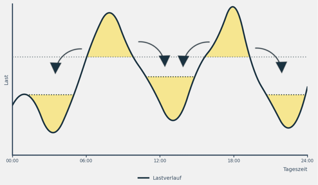 Eine Grafik, die zeigt wie Peak Shaving die Last verändert.